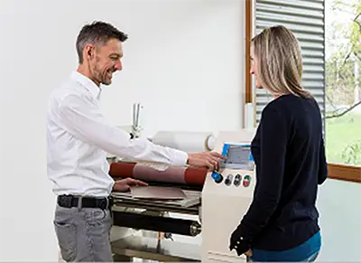 Laminatoren, Schneidemaschinen als Standardmodelle oder Sonderlösungen. Beratung, Machbarkeitsprüfungen und Prozessentwicklung sowie Lohnfertigung: